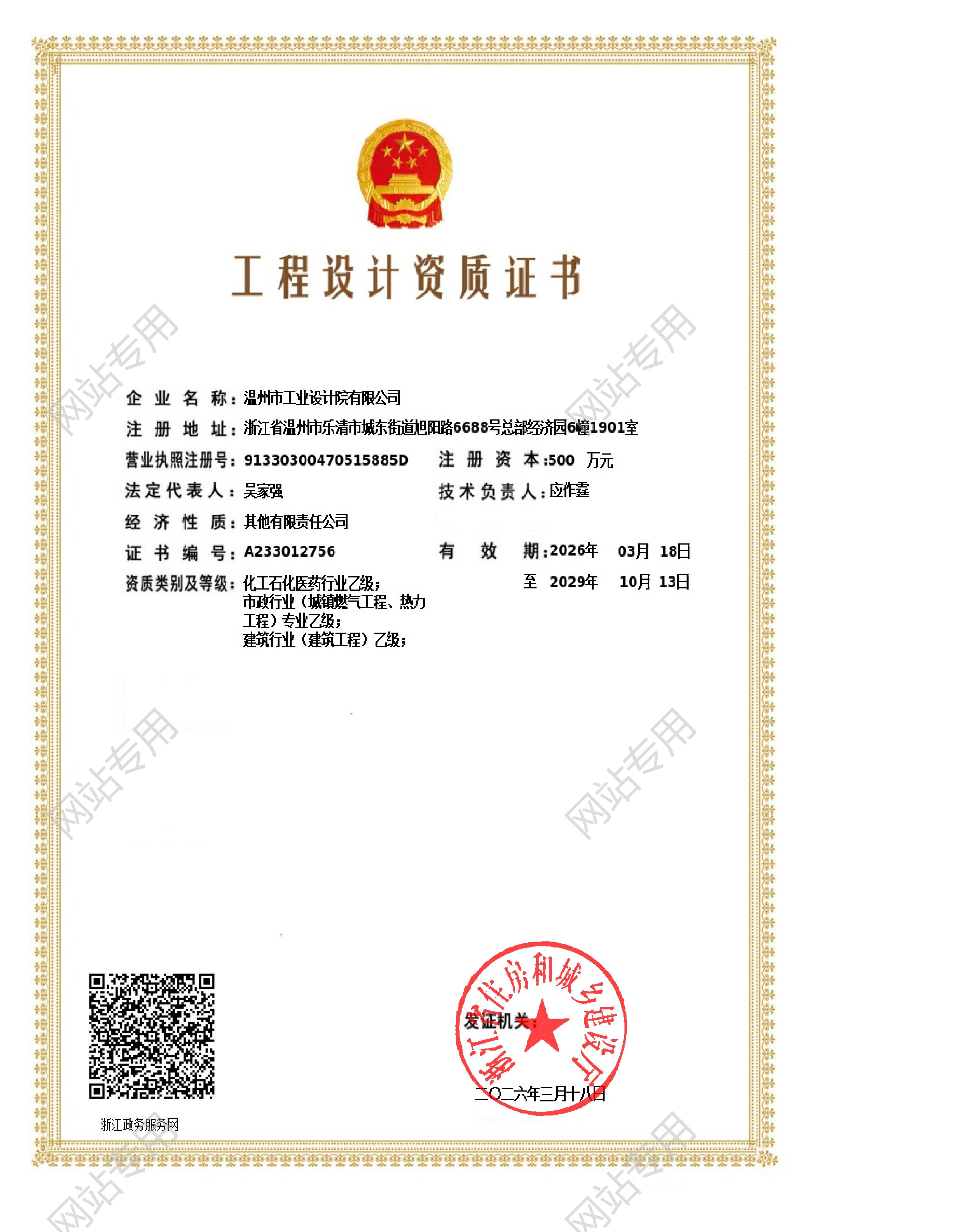 工程設(shè)計資質(zhì)證書化工市政建筑乙級
